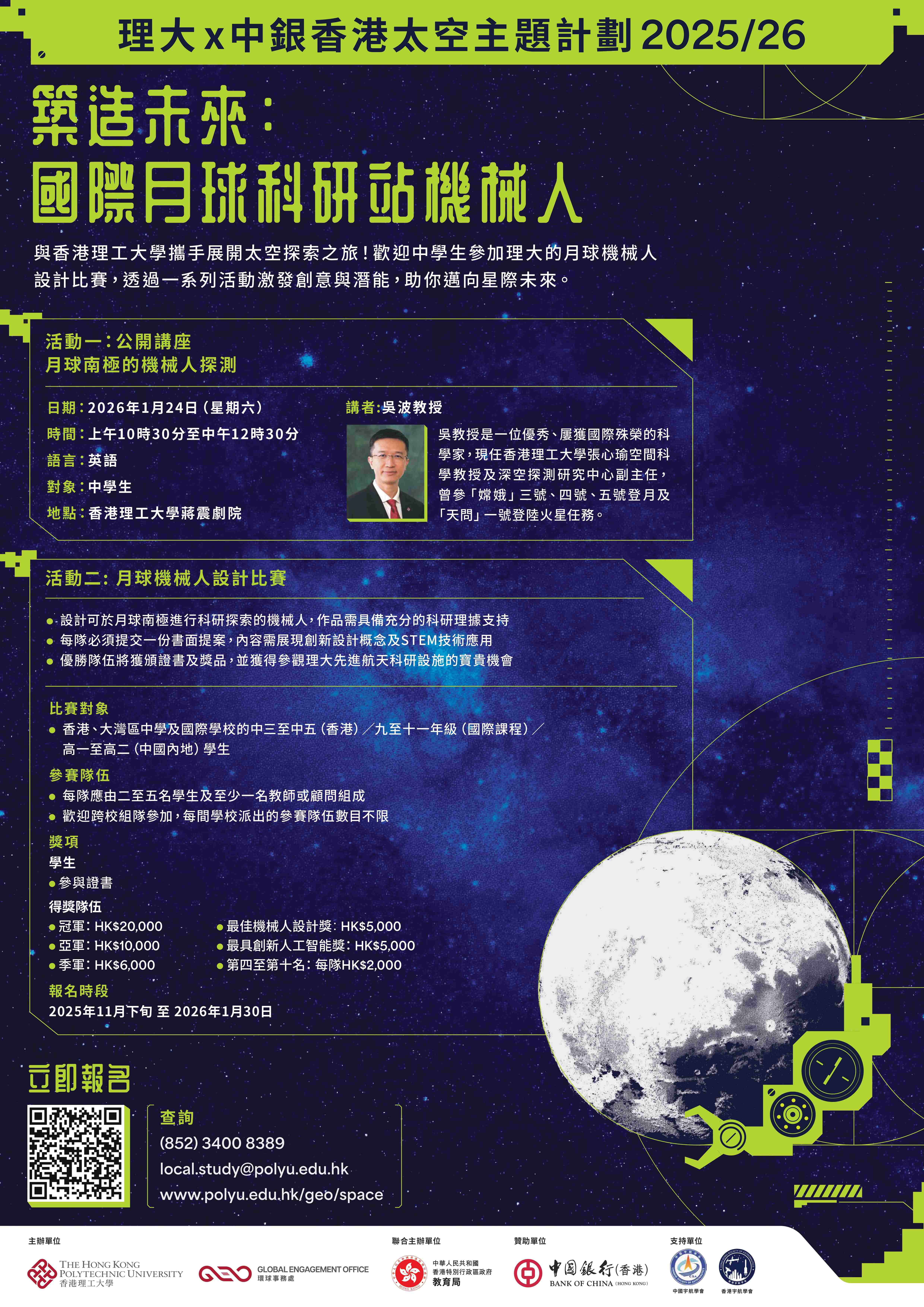 今年「月球機械人設計比賽」旨在推動STEM領域之創新,積極配合國家建造國際月球科研站與發射嫦娥七號及八號任務的航天計劃。參賽隊伍需設計具科研理據支持、能於月球南極進行科研探索的機械人,提交包括概念設計及技術圖則的提案,並附以三維印製或以數碼模型/動畫格式建立的機械人原型。公開講座及比賽現正接受報名,歡迎香港及大灣區中學中三至中五/高一至高二學生或國際學校九至十一年級(美式學制)/十至十二年級(英式學制)學生組隊參加。所有參加學生將獲發參與證書,入圍決賽學生更將獲邀參加2026年理大暑期學院。若參加學生將來透過德藝計劃申請入讀理大,於是次比賽之優秀表現將獲該計劃認可。