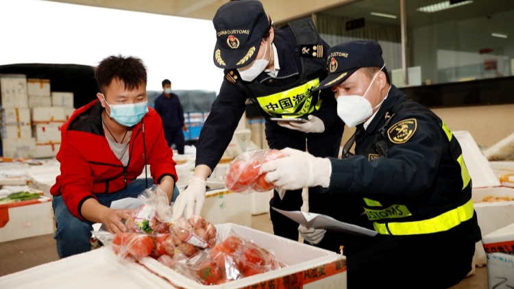 頂圖:海關關員對供澳鮮活產品進行檢查。(俞波攝)