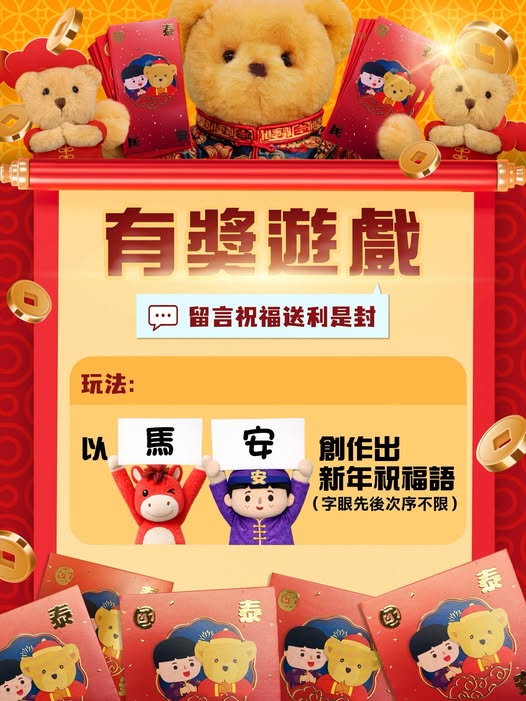 保安局在社交平台發文,稱還有半個多月就是農曆年,已準備一份小禮物—安熊利是封,網民只需用「馬」字和「安」字創作一句新年祝福語,在臉書留言區貼上大作,再Tag 3位朋友,小編就會揀出最有創意的50位幸運兒送上利是封。