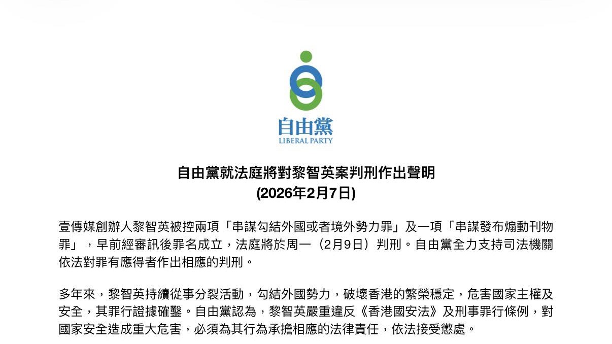 壹傳媒創辦⼈黎智英被控兩項「串謀勾結外國或者境外勢⼒罪」及⼀項「串謀發布煽動刊物罪」,早前經審訊後罪名成立,法庭將於周⼀(2⽉9⽇)判刑。⾃由黨今日(7日)發聲明稱,全⼒⽀持司法機關依法對罪有應得者作出相應的判刑。