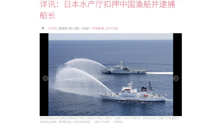 據日媒報道,日本當局於2026年2月12日在日本長崎縣外海的「專屬經濟區內」扣押了一艘中國漁船,並逮捕了船長,這是日本水產廳自2022年以來首度扣押中國漁船,值得注意的是,中國一貫不承認日方單方面劃設的所謂「專屬經濟區內」。日媒稱,此舉可能進一步加劇中日緊張關係。