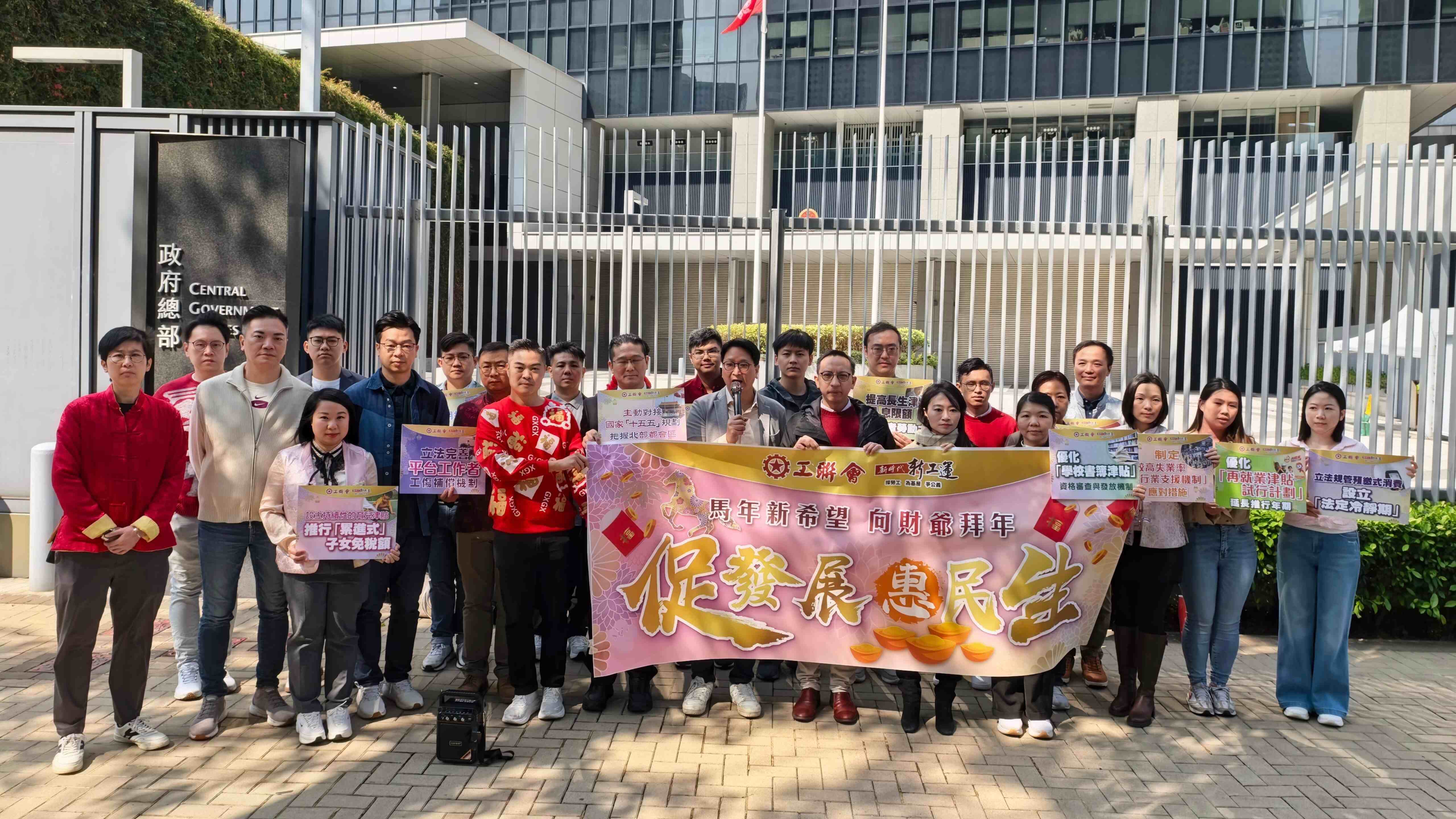 工聯會團隊高呼口號,並展示多項建議內容,寓意新一年香港經濟生機勃勃,勞工共享繁榮成果。團隊重申,希望新一年財政預算案能「主動對接十五五 提速發展惠民生」為主軸,切實回應市民及打工仔女的期望。