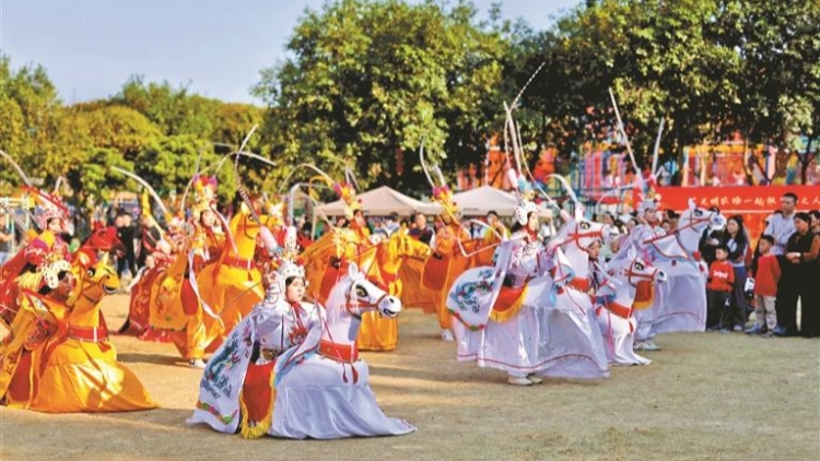 海邊的年味動感浪漫,光明農場大觀園裡則充滿田園牧歌式的溫馨。大年初二,在光明農場大觀園,鼓聲鏗鏘,彩衣舞者策「馬」奔騰。園區「光耀馬年·颯舞迎春」第二屆非遺文化節精彩上演,廣東省級非物質文化遺產饒平布馬舞沿奶牛廣場巡遊至青青草原,將流傳七百餘年的民間藝術呈現於遊客眼前。奶牛區親牛園裡,來自福田區的市民羅先生帶着4歲的兒子擠在圍欄前,看着小牛埋頭吮吸奶瓶,孩子目不轉睛。隨後,羅先生帶着孩子來到萌寵互動區,兒子蹲在圍欄邊小心翼翼給小兔遞上胡蘿蔔條。羅先生告訴記者:「城市裡長大的孩子很少有機會接觸這些,今天他親眼看到了牛奶是怎麼來的,還參與了『助鯉魚躍龍門』『圈住幸運鴨』等親子闖關活動,這一趟來得值!」