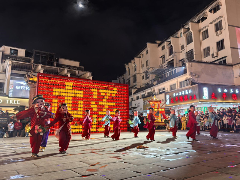 當晚的屯溪老街照壁廣場鑼鼓喧天、人聲鼎沸,隨着熱鬧的開場儀式,元宵民俗踩街活動正式拉開帷幕。屯溪舞龍舞獅氣勢昂揚、翻轉騰躍,舞和合表演詼諧生動、韻味十足,新江板凳龍蜿蜒遊走、氣勢恢宏,一個個極具徽州地方特色的傳統民俗節目輪番登場。表演者們身着特色服飾,動作嫻熟流暢,古樸靈動的表演引得沿街市民遊客駐足觀看、陣陣喝采。