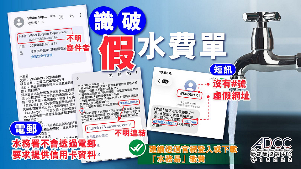 市民如收到懷疑詐騙短訊,可留意虛假水費單的5大特徵,首先,騙徒會模仿水務署發送人名稱,使用「WSD」「GOV」等字眼,例如:WSDDUHK、WSDGT HK、WSDPP HK;虛假短訊沒有「#」開頭;電郵地址為虛假。另外是費用金額低、看似合理,通常只欠數元至數十元,例如 HK$18.54、$28.26,容易令人鬆懈點擊。使用威嚇性的用字,如「逾期水費」、「即將停水」、「罰款」等威嚇字眼。水務署官方網址為www.wsd.gov.hk,騙徒會使用貼近官網的假域名如:wsdgov[.]com、wsd.govi[.]qpon/hk。最後是直接要求在可疑網站填信用卡資料和輸入驗證碼。