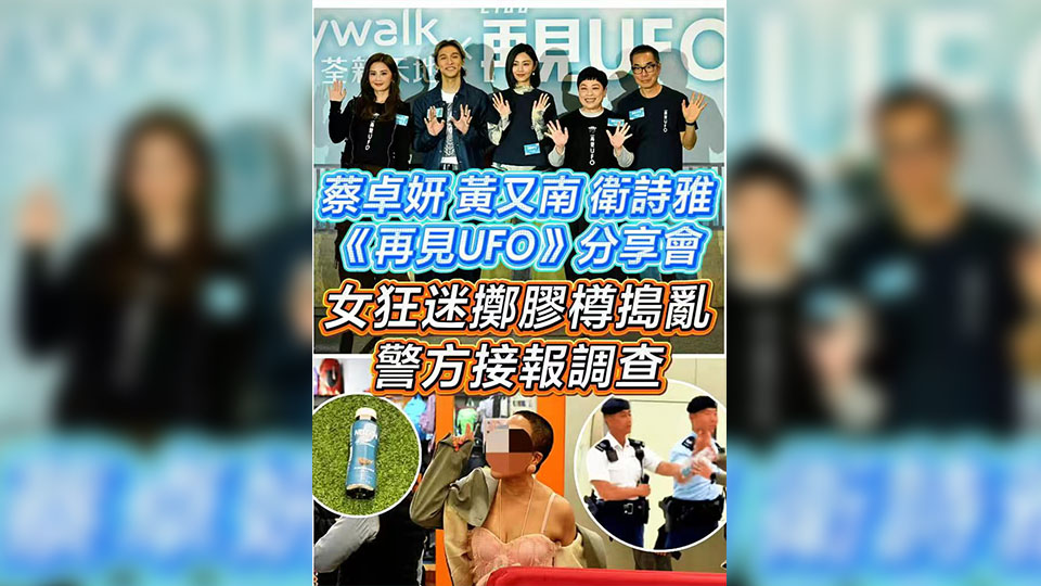 由蔡卓妍、衛詩雅、黃又南及盧覓雪主演的電影《再見UFO》,今晚(13日)於荃灣商場舉行分享會。分享會開始前,一位金發女狂迷已經開始在場外大聲指罵,當電影公司安排衛詩雅及黃又南準備接受傳媒訪問時,女狂迷從場外向二人飛擲一支樽裝飲品,幸好未有擊中二人。電影公司中斷訪問後,安排衛詩雅及黃又南返回後台。該名女狂迷隨即脫下假髮,繼續破口大罵,商場保安即時要求對方離開。稍後,警方接報到場調查,並取走樽裝飲品,然後在場巡邏。分享會在擾攘一番後,終於如常舉行。