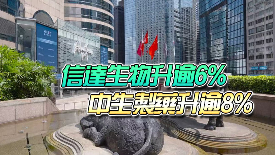 醫藥股急升,信達生物及中生製藥分別升逾6%及逾8%,是升幅最大兩隻藍籌股;翰森製藥、石藥、藥明康德、藥明生物升5%至近6%。