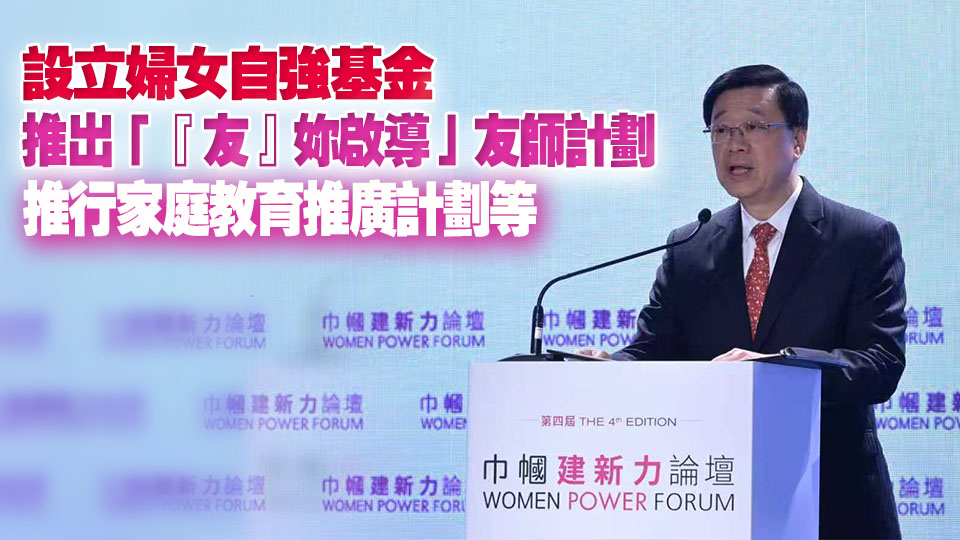 第四屆巾幗建新力論壇今日(4月1日)舉行,行政長官李家超致辭時表示,特區政府重視婦女發展和家庭建設,積極落實多項新措施,包括設立婦女自強基金,推出「『友』妳啟導」友師計劃,推行家庭教育推廣計劃及舉辦全港美好家庭選舉。這些措施為香港婦女發展和家庭建設打下了堅實基礎。