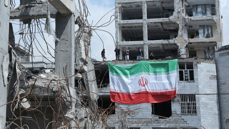 頂圖圖說: 4月20日,在伊朗首都德黑蘭,伊朗國旗懸掛在遭美以空襲嚴重損毀的居民區建築物上。(新華社)