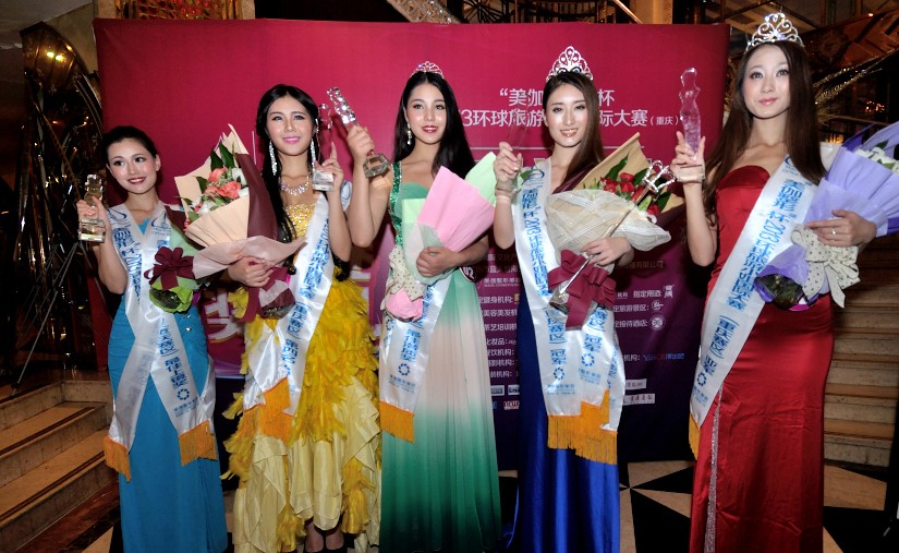 2013環球旅遊小姐國際大賽重慶賽區舉行總決賽,從左到右分別為第五名馬佳、第四名吳真、季軍吳群潔、冠軍嶽丹陽、亞軍李琳琪。
