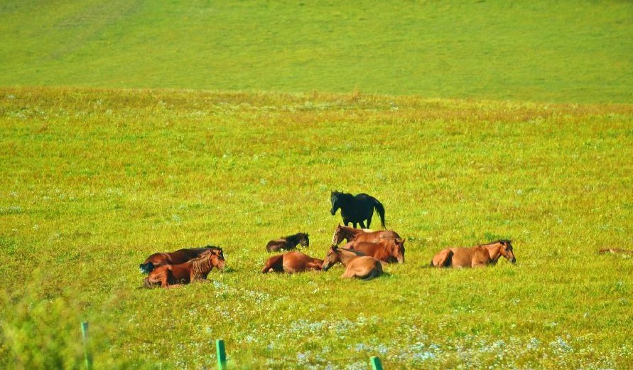 幾匹駿馬在烏蘭布統草原上休息