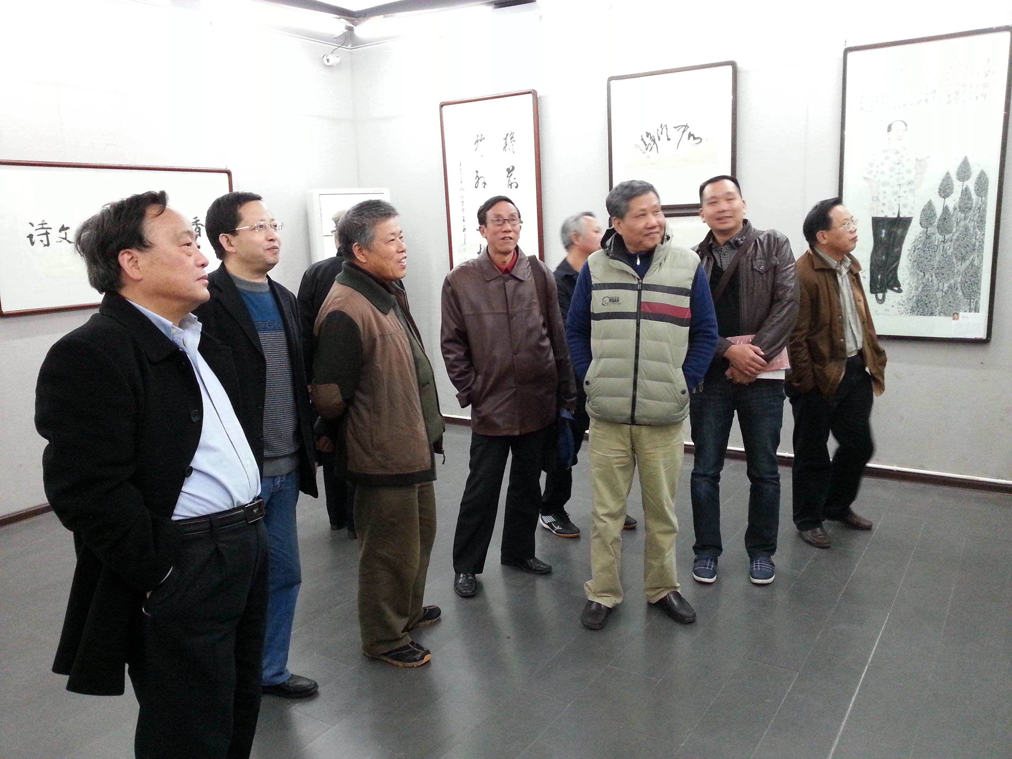 大展策展人甘建华(左二)陪同下观赏参展作品。 黄五一摄