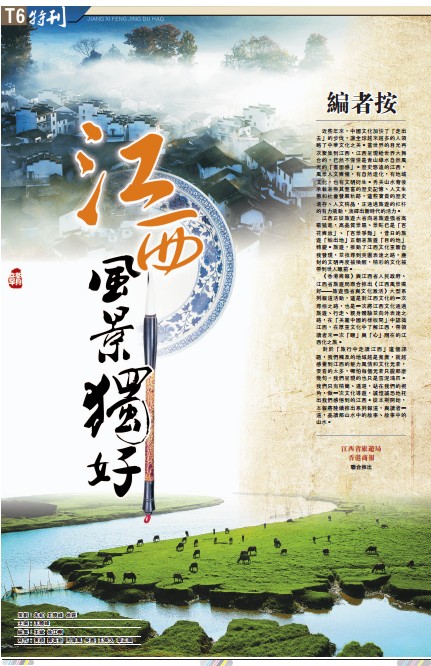 記者手記 有學者做過一個很形象的比喻,說「文化就像是一個洋蔥,有很多很多層」。江西這片土地的精神和脾氣是從鄱陽湖浩瀚烟波漣漪洇潤開來的,是從唐詩宋詞流淌出來的,是歷史積澱的色彩一塊一塊堆積出來的。它所攜帶的各種文明信號,都在靜默的山水石磚中存在,任我們打量。極少的文字與圖片難以承載這塊版圖上的獨好風景。我們希望,關於江西的各種話題,能夠轉換成你某個镕暇假期里的一張車票或是機票,來一場說走就走的旅行,目的地--江西!