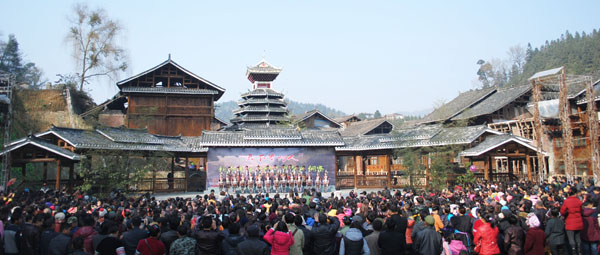 在肇兴侗寨萨玛天岁表演场,旅美华人歌唱家尤雁子,苗族著名歌唱家阿幼朵,苗族“影视歌”三栖明星王飞鸿等与当地的侗族姑娘、小伙一起倾情演艺。《善良的姑娘》、《男儿当自强》等精彩节目,为当地侗族群众呈现了一场现代歌舞与侗族原生态歌舞交汇的文化盛宴。图为活动现场。