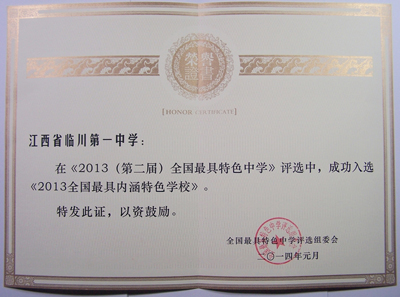 图为临川一中入选2013全国最具内涵特色学校奖状(饶礼喜摄)