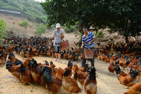 在广西昭平县黄姚镇北莱村黄姚绿金土鸡养殖基地,合作社成员在给鸡喂食玉米