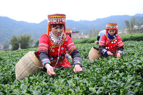 采茶姑娘在广西昭平县走马乡庙枒村龙湾无公害生态茶园采摘春茶.