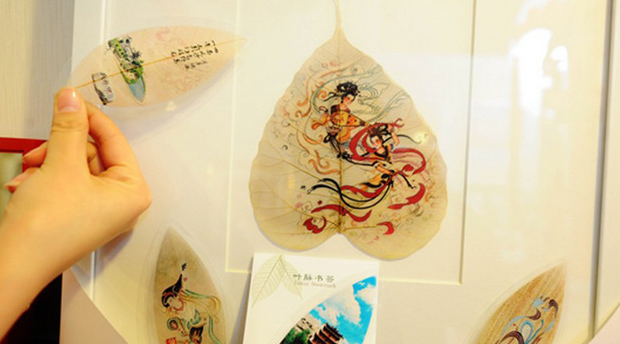 今年年初,一家名为“丝路坊”的文化创意小店在人流密集的兰州市城关区大众巷开张了。店内一个个精致的工艺品,或时尚、或朴拙,背后都有一段动人的故事。图为用树叶制作的具有敦煌元素的书签。中新社发 杨艳敏 摄