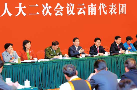 12日下午,出席第十二届全国人大二次会议的云南代表团举行全体会议。