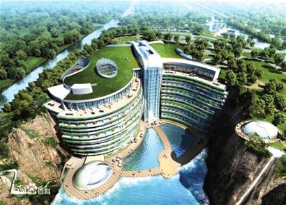 佘山深坑酒店被称为“海拔最低五星级酒店”。根据规划,深坑酒店的屋顶是漂亮的“空中花园”;坑下部分,水上14层是酒店的主体,主要设置标准客房,水下2层包括水下情景套房和千人宴会大厅、恒温SPA和休闲泳池等。