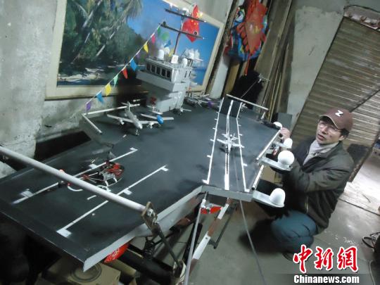 “去年整整花了一年的时间,终于在今年年初试水成功。”张师傅一边高兴地说着,一边演示飞机在预定的轨道上降落和起飞。该“航母”甲板上有8架舰载机,包括预警机、无人机、歼15和直升机,且配有拦阻索、弹射器,可以多次成功起降。