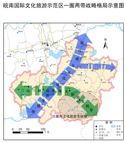 《纲要》指出,皖南国际文化旅游示范区今后将着力打造“一圈两带”文化旅游发展格局。“一圈”是指古徽州文化旅游发展圈,充分展示新安理学、新安医学、新安画派、徽派建筑、徽商文化、文房四宝、徽菜、徽茶等历史文化魅力,保持徽州文化的完整性,推动徽州文化与青山秀水、美好乡村联动,形成以黄山为中心、辐射周边的山水文化旅游圈,不断提升国际知名度和美誉度,把古徽州文化旅游发展圈打造成美丽中国建设的典范。