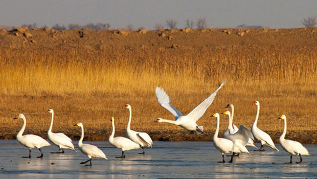 野生白天鹅栖息内蒙古 准备跨国“旅行”