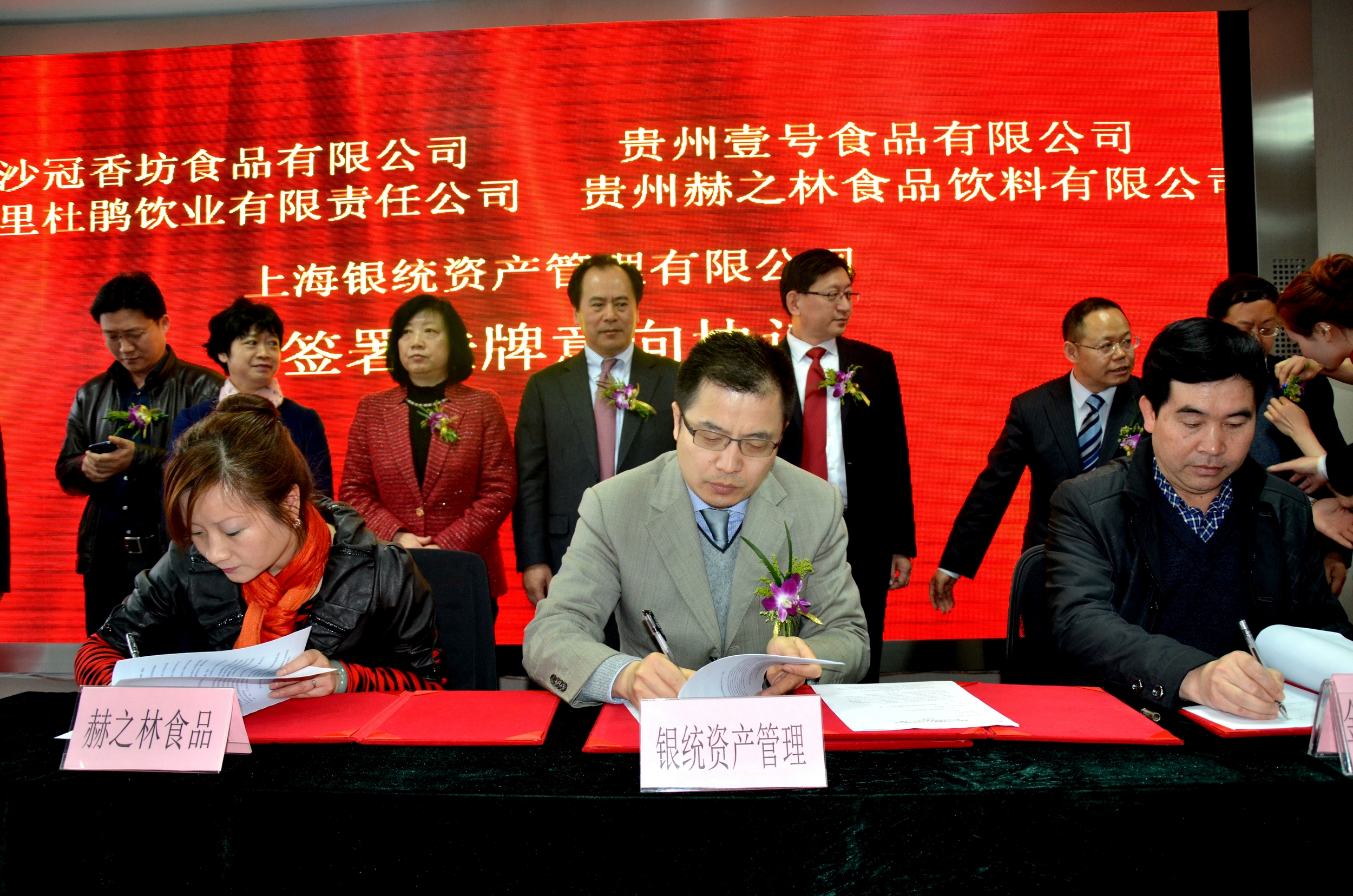 挂牌仪式上,上海银统资产管理有限公司董事长陈鸣忠与金沙冠香坊食品有限公司、贵州赫之林食品饮料有限公司、贵州壹号食品有限公司、百里杜鹃饮业有限责任公司企业代表签署挂牌服务协议。出席领导并为集体挂牌的13家企业分别颁发了纪念牌,挂牌的企业与出席领导共同敲响挂牌锣。