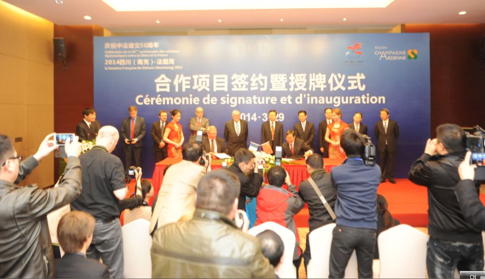 【香港商报讯】记者梅超报道:3月29日上午,“2014四川(南充)·法国周”合作项目集中签约暨授牌仪式举行。在签约仪式现场,法国香槟-阿登大区主席让-保罗·巴希先生与南充市市长向东签订中法文化创意产业园项目向顺庆区人民政府授“中法文化产业创意园”牌匾。此次南充与法国香槟-阿登大区及相关部门共签订6个合作协议。
