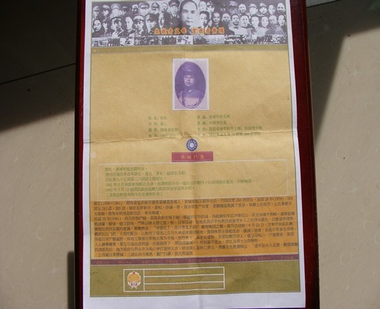 从邵东县城出发,过宋家塘再往北,不过3公里,便来至湖南省邵东县黑田铺镇观音阁村。黄红将军胞侄黄新益先生及该村村支书黄三定先生热情的接待了我们。谈话间,黄新益找来《涟河马岭黄氏五修族谱》,打开一看,上面有关于黄红将军的文字记载:祥宽,任第二子,册名心素,学名略字海涛,由湖南省立中学校毕业后,考入黄埔军官政治学校,毕业后任第二师九团三营十一连上尉连长,达升九十五师副师长,少将衔,兼二百八十四团上校团长……