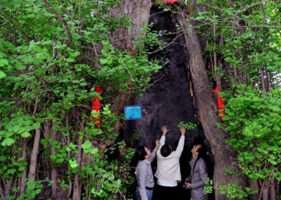 游人在古银杏树下的“空洞”里参观(4月27日摄)。