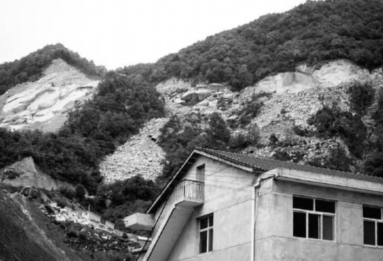 宁陕县城关镇青龙村三组紧挨着秦岭山脉的峰堡寨隧道口,旁边就是县城连接西汉高速的公路,村民的房屋一字排开在公路边。村民告诉记者,采石厂炸山的地方到村子的直线距离,最近的地方只有大约300米,几乎就在隧道口正上方的山脉。5月5日上午,记者赶到隧道口的时候看到,在采石厂办公楼的正上方的山脉,堆积着大量的碎石,村民说都是炸山之后掉落的。