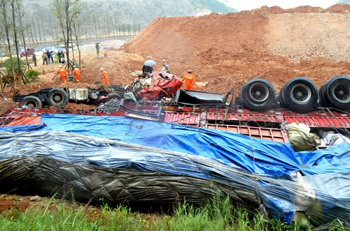 [香港商报讯] 记者 黄庆松 通讯员 张晓龙 报道:5月15日,记者从贵州省凯里市消防特勤中队获悉,早上7时许,沪昆高速贵州省凯里路段工友大桥处,一辆满载五金制品的货运大挂车从约20米高的桥上坠落,仰翻摔落在泥土堆里,车辆解体,车上2人当场遇难。