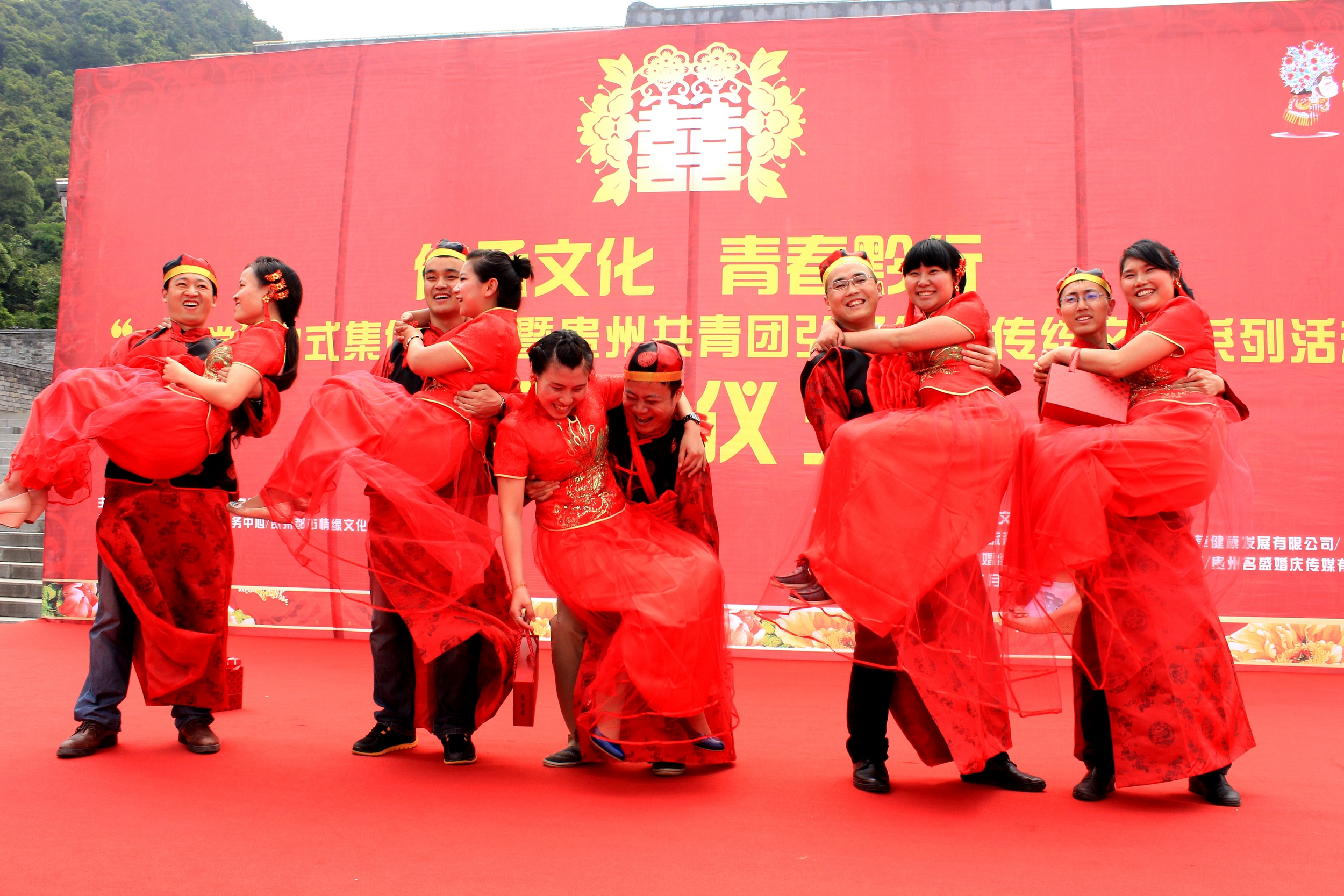 [香港商报讯] 记者 黄庆松 报道:5月20日,由贵州省文明办、团省委举办的孔学堂中式集体婚礼暨“传承文化。青春黔行”主题系列活动在贵阳举行。来自省内的66对新人,齐聚贵阳孔学堂,免费体验汉唐式婚礼。