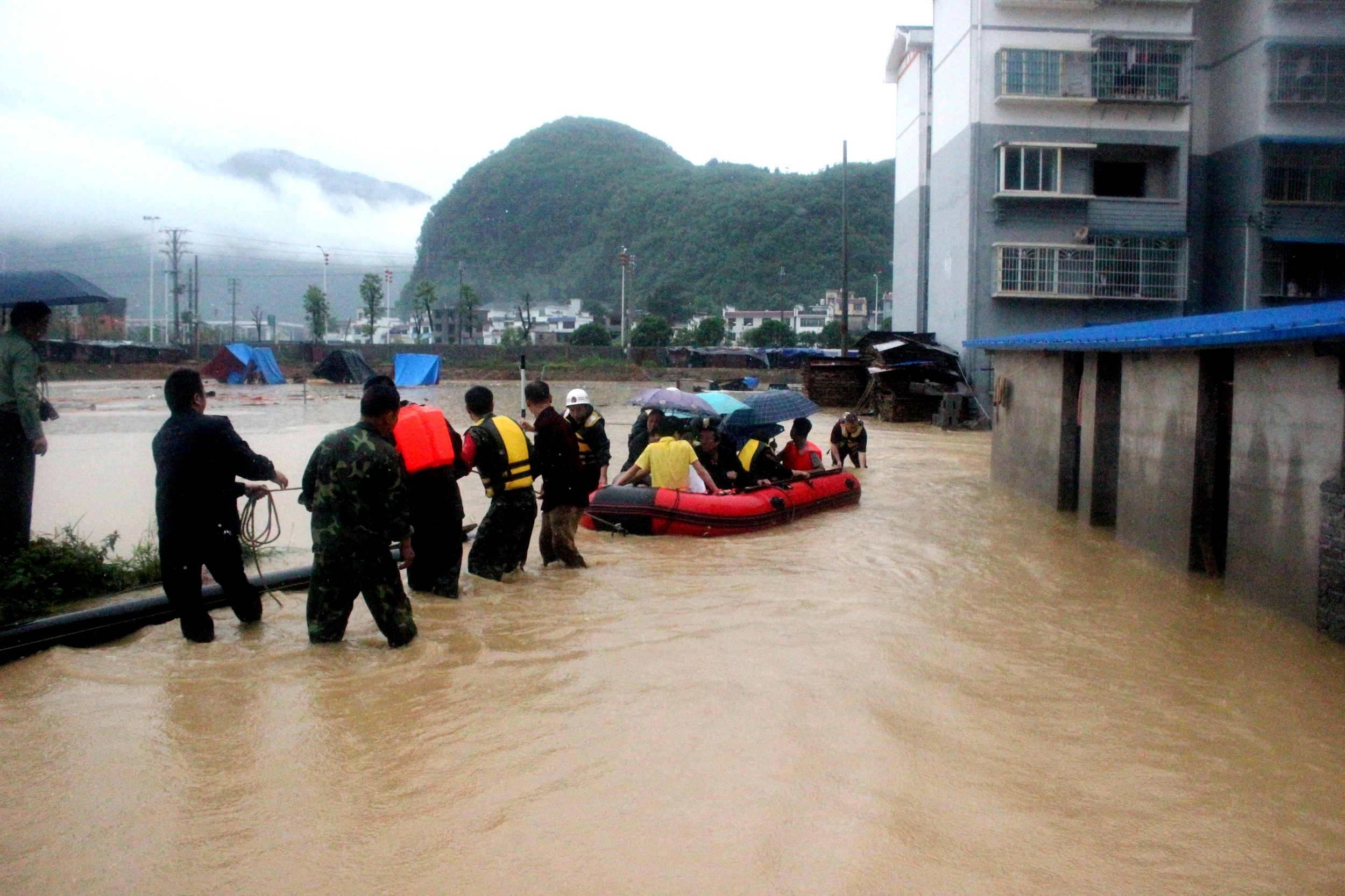 在石阡县一驾校被淹,车辆损坏严重,黄金都小区数百名群众被困,消防人员利用冲锋舟转移200余人。
