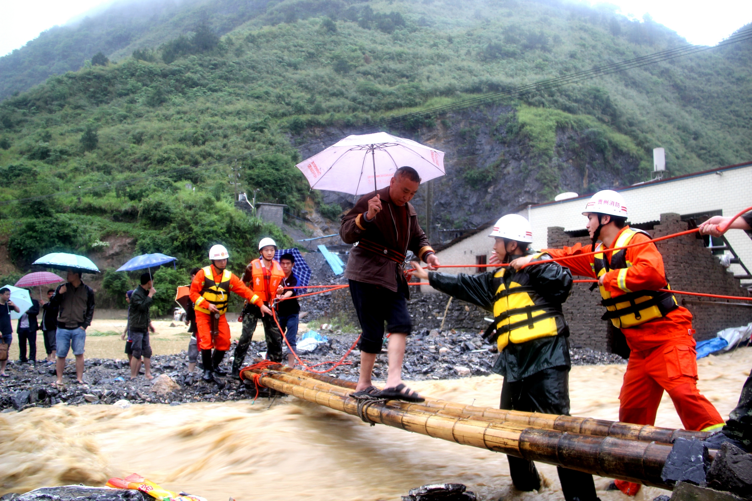 在碧江区清水村龙塘组,由于山洪的影响,部分路段被冲毁,救援人员步行两公里到达救援现场,将竹杆捆在一起做成竹排,两头由官兵用绳索搭起生命通道,将被困的11名群众安全转移。与此同时,消防救援人员还将冲毁路段的杂物和树胶管进行切割,使道路恢复通行。