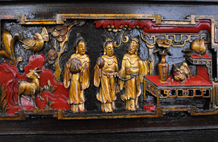 本县黑田铺乡一村民家有一清代的人物面盆架,规格70cm×168cm,顶部雕双龙戏珠,屏心透雕卷草底纹和“一举中喜”人物,比例优美、形象生动、色彩华丽、工艺精湛,是清式家具中的精品代表作。肖健东几次登门求购,诚心打动户主,终于收购成功。两个月后,这户人家的房子被大水冲毁,抚摸逃过一劫的“宝贝”,他饱含深情地说:不知是我有幸遇到了它们,还是它们有幸遇到了我……