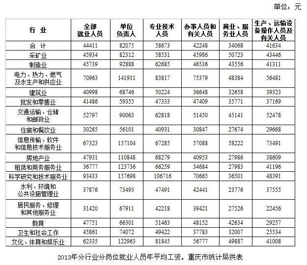 记者了解到,2013年,重庆市统计局在一套表联网直报单位范围内对不同岗位的工资情况进行了调查,涉及16个行业门类的1.89万家法人单位。调查单位的就业人员按岗位分为单位负责人,专业技术人员,办事人员和有关人员,商业、服务业人员,生产、运输设备操作人员及有关人员5类。