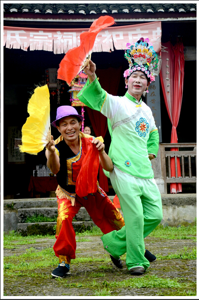 “崴步”都有手部动作配合,表现为手中的道具和扇子的“手中花”和“扇花”的种种变化。如“手中花”有平绕花、下挽花、挑绕花、后翻花、双绕花、侧甩巾、小甩巾、背巾等。“扇花”则更多了,有70多种变化,有的名称也特别富有诗情画意,如怀中抱月、蜻蜓点水、金丝滚绣球、雪花盖顶、凤点头等。这些安排在茶灯戏中更增添了茶灯戏的歌舞色彩的情调、韵味。