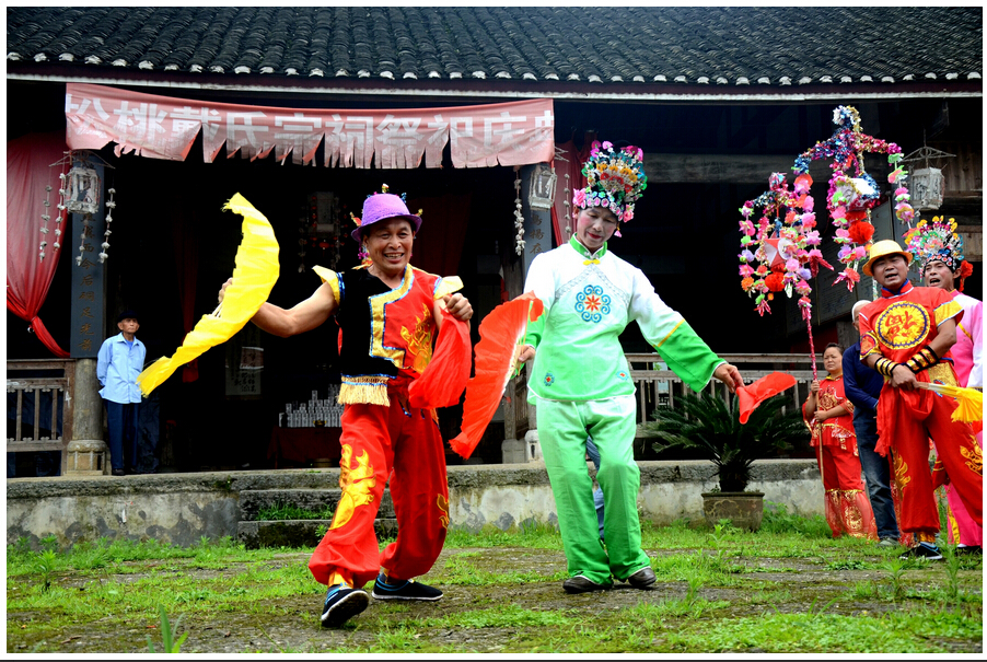 松桃茶灯仪式中的外在表现也具有一定的隐喻意义,包括道具、舞蹈动作、场景转换等。如舞者手中的蒲扇好像就是一个具有神力的万能道具,它根据不同表达内容,具有不同的功能,是跳茶灯必备的、有象征意义的道具:采茶时就是背篓,“双飞燕”时便成了燕子,斩鬼神时就是刀。舞蹈动作中“门斗转”,女高男低,赖花子围着幺妹子转圈,寓意祖先崇拜;太公摇浆则是述说民间传说故事,其隐喻更丰富;赖花子通过三脚猫、矮桩步等“丑态”反衬出女性的美,暗示对女性的讨好等。松桃茶灯仪式的隐喻,无处不在,处处都隐喻着人们心灵深处的那些情感。