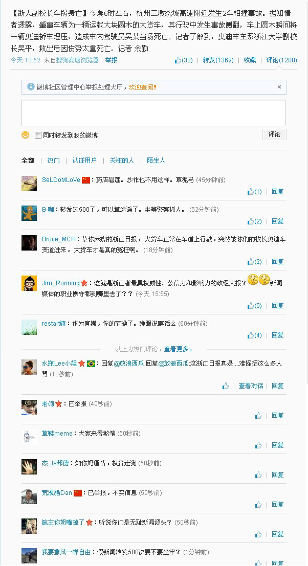 该事故引发网民热议,多数集中在批判当地媒体报道失实。此前《浙江日报》官方微博称,“肇事车辆为一辆运载大块圆木的大货车,其行驶中发生事故侧翻,车上圆木瞬间将一辆奥迪轿车埋压,造成车内驾驶员吴某当场死亡。”将事故责任推给了货车司机。而监控视频显示,在杭州绕城高速公路上,事发时一辆黑色轿车正行驶在最内侧车道。黑色轿车驶过匝道导流线后忽然变道行驶,后与在其右后侧方正常行驶的大货车发生碰撞,大货车碾压至黑色轿车之上并拖行一段距离,最终撞上隔离带后侧翻停下,大货车上的大块圆木随之倾倒在路面上,并将黑色轿车掩埋。由此可见事故责任并不在货车司机。记者就此事拨打杭州市交警支队交警支队宣传处电话0571- 87282315,然而,至记者截稿时都无法接通该电话。