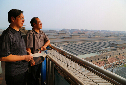 本报副编辑张健文与作家董立勃观赏汾酒文化景区