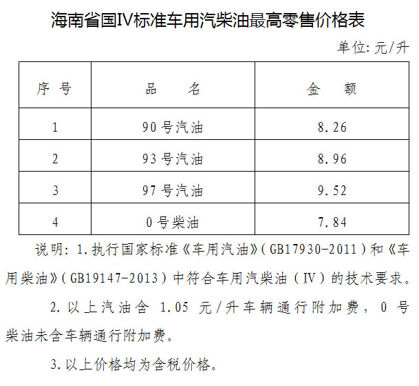 据介绍,根据《国家发展改革委关于提高国内成品油价格的通知》规定,海南省国Ⅳ标准车用汽柴油价格调整有关事项如下: