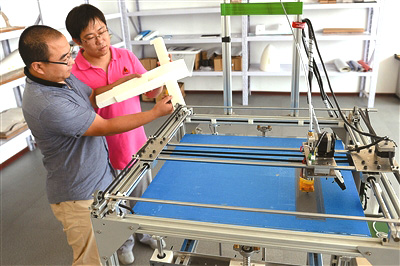 “打印飞机,使用的是PLA工程塑料,经过测试,这种材质与原先的碳纤维复合材料相比,在强度上并没有降低,完全符合无人机的飞行条件。”窦城对记者说,这种工业级别的3D打印机,只要将图纸和原材料放入打印机,就可以直接打印长1米、宽0.6米的任何物体。而从打印时间上看,达到实验级别的飞机,打印机头和机身各需要10多个小时,这比在工厂里动辄一周的生产时间相比大大缩短,而且还减少了在实验阶段更换飞机部件,每次开模具的时间和费用。