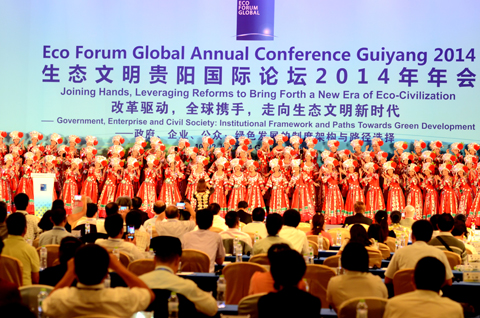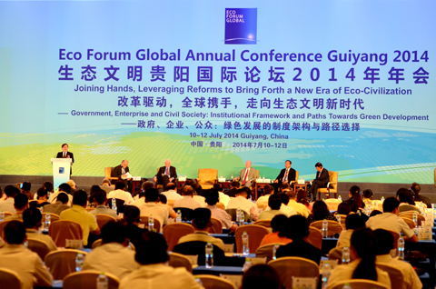 闭幕式上,生态文明贵阳国际论坛秘书长章新胜发布2014年《贵阳共识》,呼吁全球携手,走向生态文明新时代。