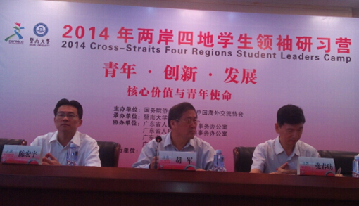 主题为“青年·创新·发展——核心价值与青年使命”的2014两岸四地学生领袖研习营,于21日在暨大开营。该活动是由国务院侨务办公室、中国海外交流协会共同主办,暨南大学与广东省台办、港澳办等机构共同承办协办。该活动共有来自海内外30多所高校100名学生参加,这100名学生分别来自台湾、香港、澳门及内地的高校在校学生,将通一周的时间研习传统文化,还会相互结队组班去广东周边地区进行参观寻访,让海内外年轻人通过了解祖国,共同传承优秀的中华文化。