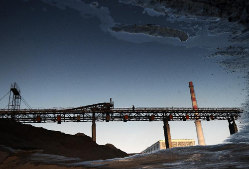 在山西省孝义市,一名工人的身影倒映在煤场的积水上