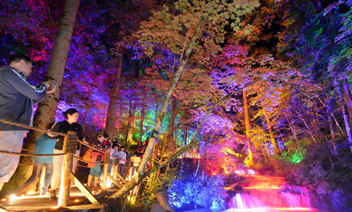 7月27日,一些游客在大戏台河景区观赏河上美景。 7月27日晚,众多游客来到吉林长白山林区的大戏台河原生态景区,感受夜景系统下灯光与森林的巧妙融合。大戏台河景区夜景系统于2013年建成,整个森林河谷夜间霓虹迷离,如梦如幻。