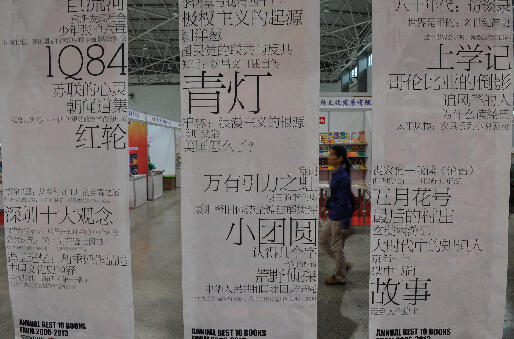 一名参观者从印满书名的帘幕旁走过