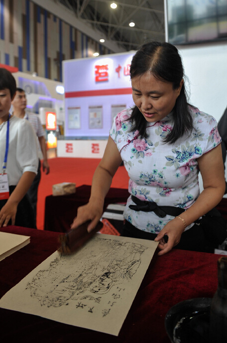 一位参展代表在现场拓制年画
